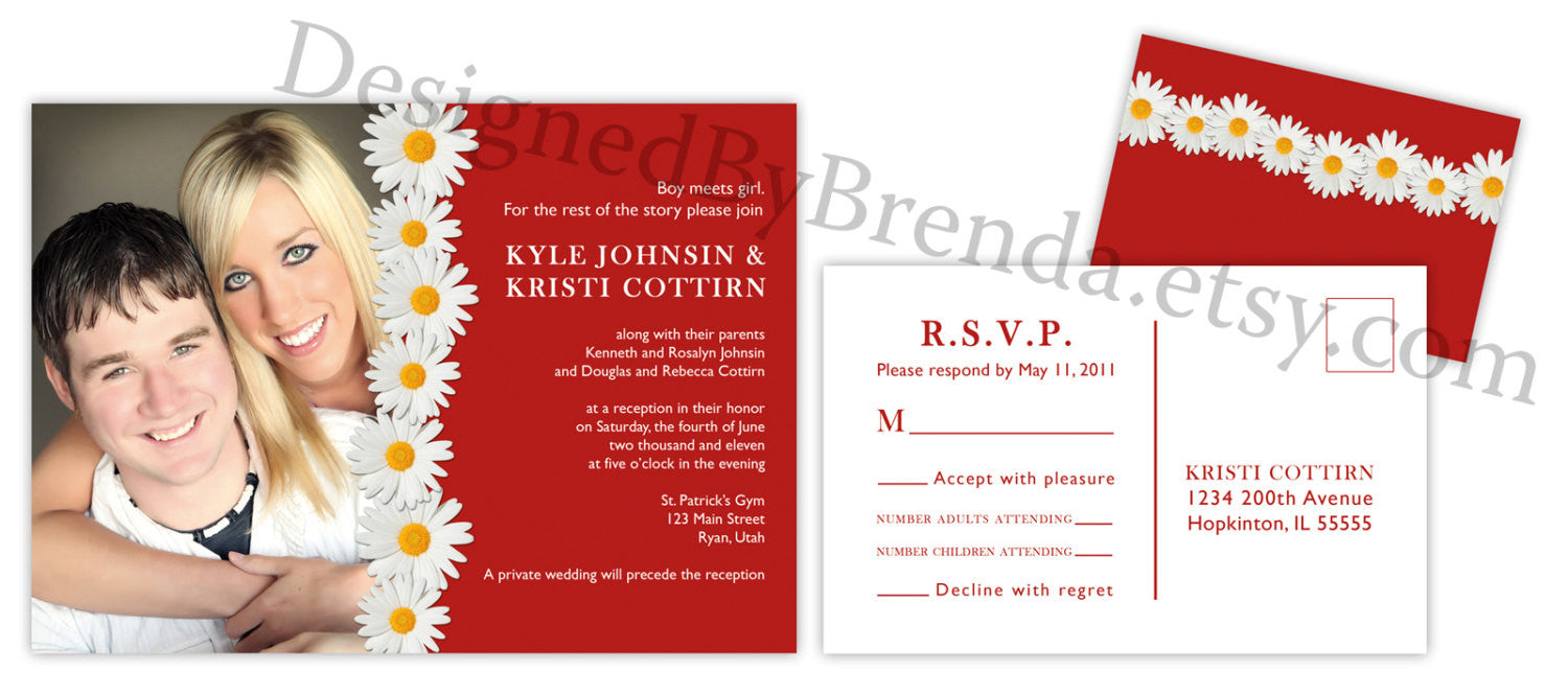 These daisy wedding invitations can be customized to fit your event! Whether it be a wedding, baby/bridal shower or birthday party, these invitations are perfect! All text, fonts and colors can be customized. I can even change the color and type of flower (instead of a daisy).